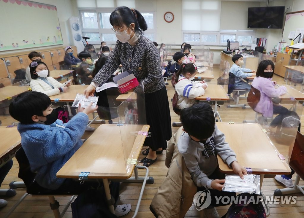 | ▲ This photo taken on March 2, 2022, shows a teacher handing out COVID-19 self-test kits to students at Bongmu Elementary School in Daegu, 300 kilometers south of Seoul, amid the rapid spread of omicron virus variant. (Yonhap) |