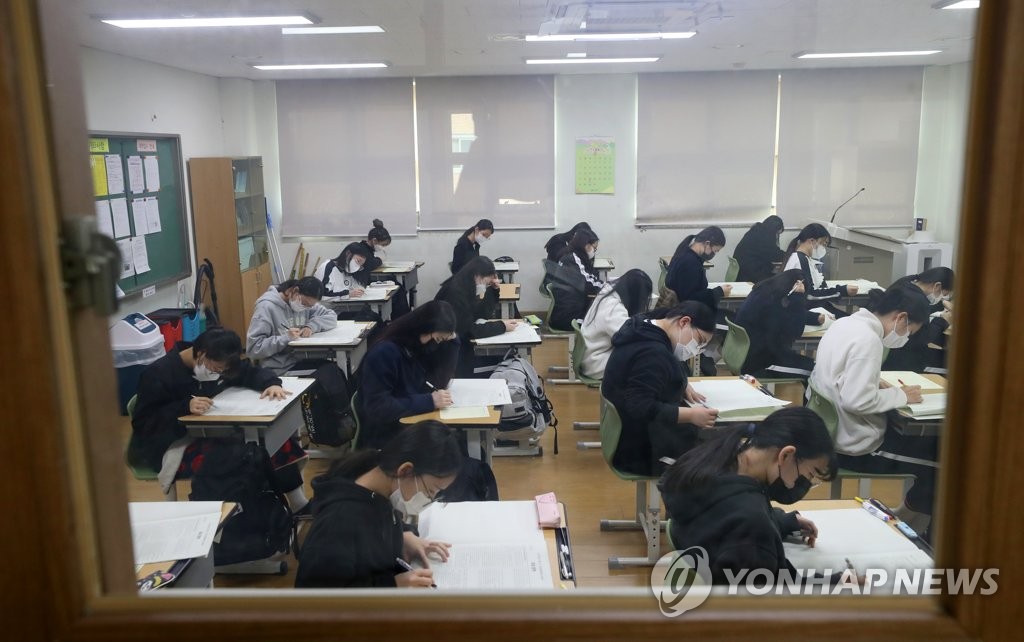 ▲ A class of students takes this year's first nationwide examination at a high school in Chuncheon, Gangwon Province, on March 23, 2021. (Yonhap)