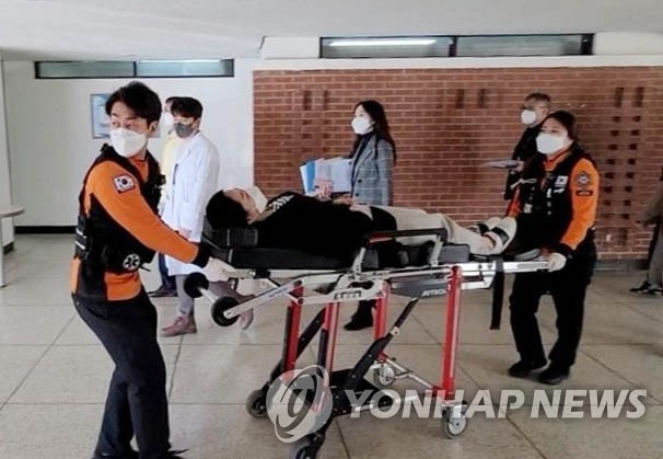 ▲ This photo taken March 22, 2021, and provided by the South Jeolla provincial government shows medical workers transporting a patient to receive a coronavirus vaccine in Mokpo, 410 kilometers south of Seoul, in a simulation training. (PHOTO NOT FOR SALE) (Yonhap)