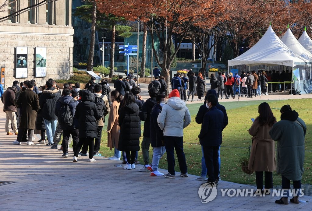 | ▲ Citizens wait in line to get tested for COVID-19 at a temporary test site in front of Seoul City Hall on Nov. 24, 2021. (Yonhap) |