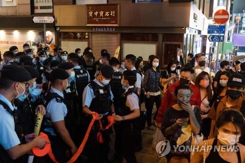 | ▲ 핼러윈 축제 인파 통제하는 홍콩 경찰 (홍콩 AFP=연합뉴스) 지난 30일 밤 홍콩 최대 유흥가 란콰이펑에서 경찰들이 통제선을 치는 모습. 2021.10.31. photo@yna.co.kr |