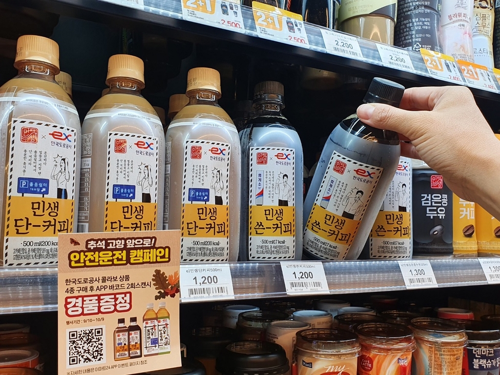 ▲ 이마트24는 한국도로공사와 손잡고 추석 명절 기간 졸음운전 방지 캠페인을 펼친다고 14일 밝혔다. 이마트24는 자체 브랜드(PB) 상품인 민생커피 2종과 민생옛날차음료 2종의 겉 포장에 졸음쉼터 표지판과 충분한 휴식 독려 메시지를 담아 이마트24 전국매장과 도로공사 관할 휴게소 내 편의점에서 판매한다. (서울=연합뉴스)