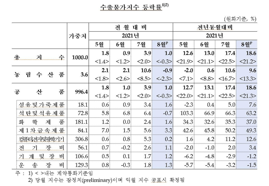 최 팀장은 수출물가 상승 배경에 대해 "원/달러 환율 상승과 수요 증가 등의 영향"이라고 분석했다.