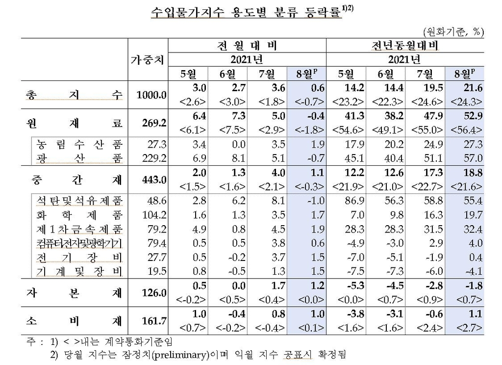 전월 대비 상승률을 품목별로 보면, 원재료 중 농림수산품(1.9%)은 올랐지만 광산품(-0.7%)이 떨어졌다. 중간재 가운데 1차금속제품(1.9%), 화학제품(1.7%)은 높아졌고, 석탄·석유제품(-1.0%)은 낮아졌다. 8월 국제 유가가 두바이유 기준으로 한 달 새 4.7% 하락한 영향이다.