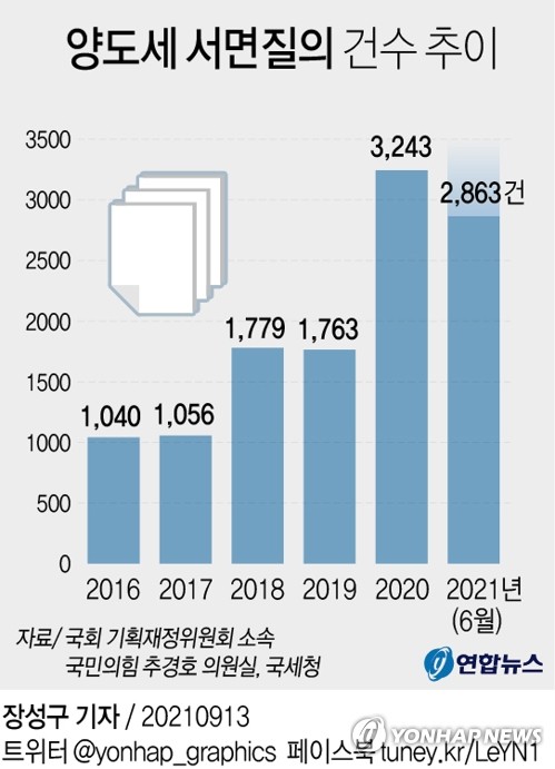 (세종=연합뉴스) 차지연 기자 = 지난해 국세청에 3천건 넘는 양도소득세 관련 서면질의가 쏟아진 것으로 나타났다.