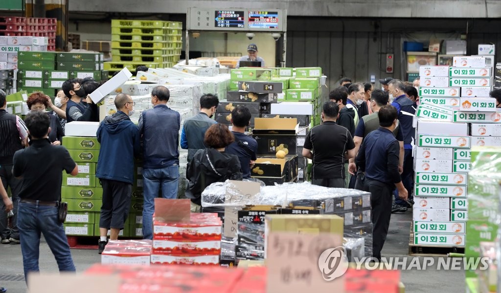 | ▲ 추석 성수품 과일 경매 지난 8일 오전 서울 가락농산물도매시장 한 청과도매시장 경매장에서 출하된 추석용 과일을 경매하고 있다. [연합뉴스 자료사진] |