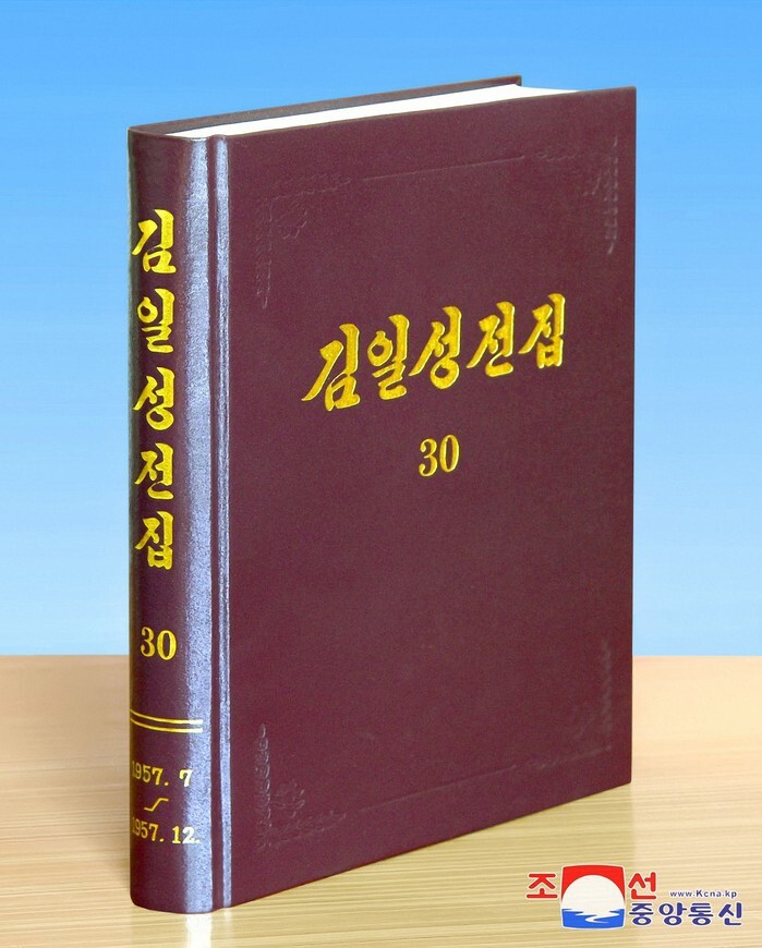 This photo, released by North Korea's official Korean Central News Agency on June 13, 2024, shows the recently published revised 30th volume of the "Complete Collection of Kim Il-sung's Works," a chronological compilation of speeches, statements and decisions made by the late North Korean founder from July to December 1957. (For Use Only in the Republic of Korea. No Redistribution) (Yonhap)