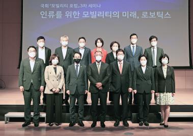 '인류를 위한 모빌리티의 미래, 로보틱스'를 주제로 열린 이날 세미나에는 포럼 공동 대표인 이원욱 더불어민주당 의원과 권성동 국민의힘 의원을 비롯한 포럼 소속 국회의원들과 정 회장, 정만기 한국자동차산업협회장 등이 참석했다.