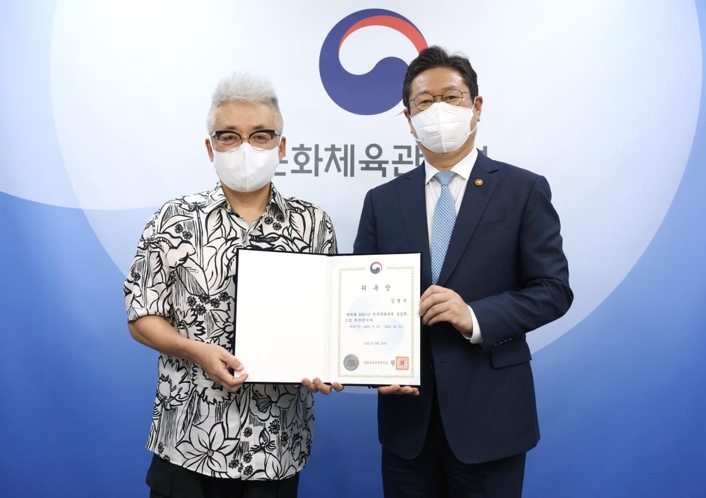 | ▲ 한국문화축제 총감독 김형석 작곡가 위촉 (서울=연합뉴스) 황희 문화체육관광부 장관(오른쪽)이 13일 서울 용산구 문체부 저작권보호과 서울사무소 회의실에서 김형석 작곡가에게 한국문화축제 총감독 위촉장을 수여한 뒤 기념촬영을 하고 있다. 2021. 9.14 [문체부 제공. 재판매 및 DB 금지] |