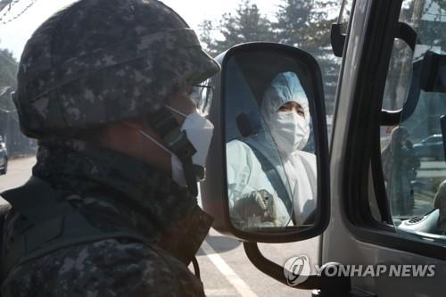 | ▲ A service member checks a bus for quarantine work at an Army boot camp in the northern county of Yeoncheon on Nov. 26, 2020, after dozens of newly enlisted soldiers tested positive for the new coronavirus. (Yonhap) |