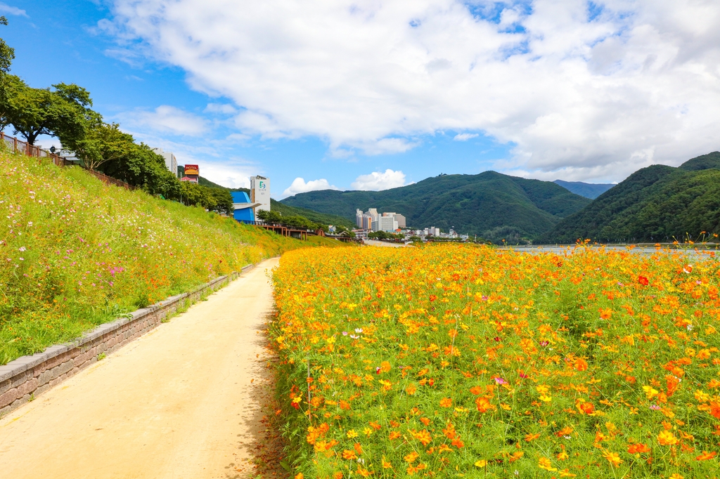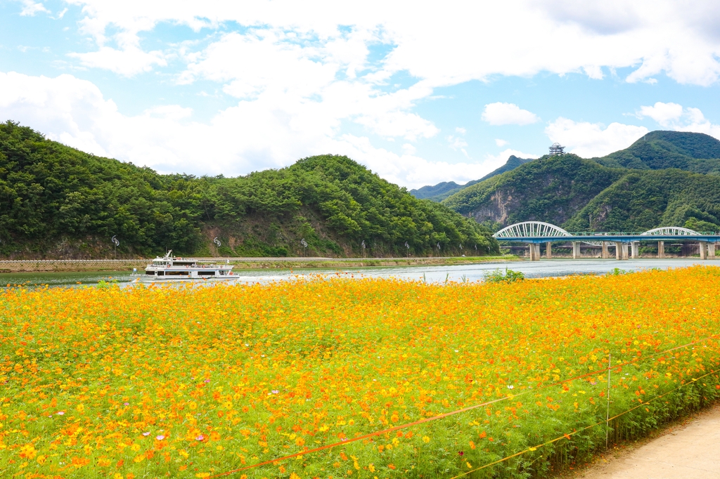 23일 단양군에 따르면 40억원을 들여 단양읍 별곡리∼상진리 수변 2.4㎞ 구간 3만1천여㎡에 파종한 백일홍, 샤스타데이지, 코스모스 등 가을꽃이 만개해 가을 정취를 만끽할 수 있다.