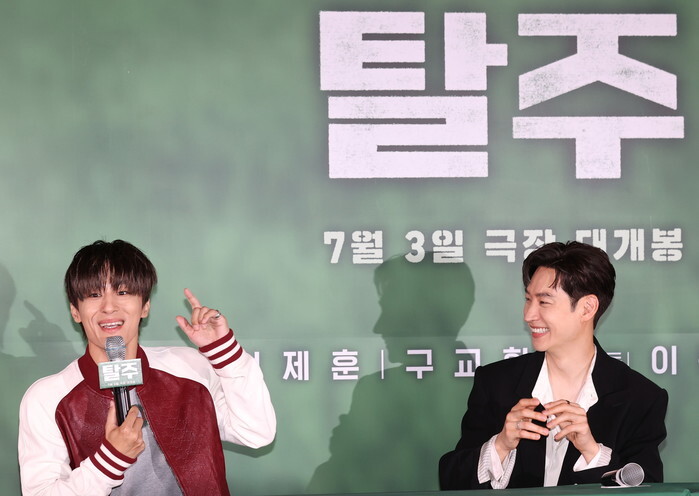 South Korean actors Lee Jae-hoon (R) and Koo Kyo-hwan, who star in the new movie "Escape," respond to reporters' questions during a publicity event in Seoul on June 17, 2024, to promote the movie that is set to hit local screens in South Korea on July 3. (Yonhap)