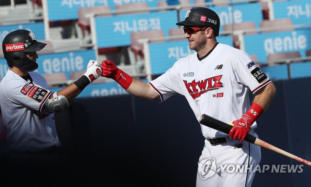 | ▲ In this file photo from Sept. 12, 2021, Jared Hoying of the KT Wiz (R) bumps fists with a teammate after hitting a two-run home run against the SSG Landers in the bottom of the sixth inning of a Korea Baseball Organization regular season game at KT Wiz Park in Suwon, some 45 kilometers south of Seoul. (Yonhap) |