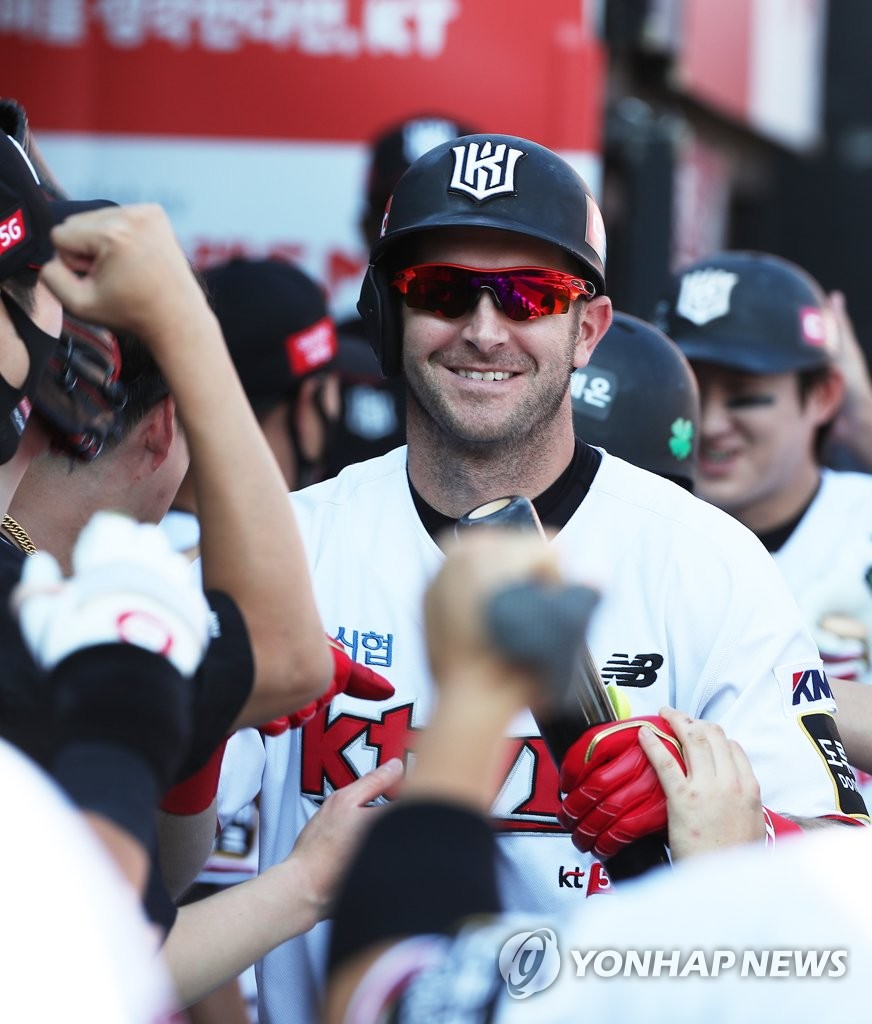 | ▲ In this file photo from Sept. 12, 2021, Jared Hoying of the KT Wiz is congratulated by teammates after hitting a two-run home run against the SSG Landers in the bottom of the sixth inning of a Korea Baseball Organization regular season game at KT Wiz Park in Suwon, some 45 kilometers south of Seoul. (Yonhap) |