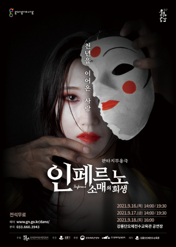 강릉단오제전수교육관은 제작공연 판타지무용극 '인페르노 소매의 희생' 공연을 16일부터 18일까지 강릉단오제전수교육관 공연장에서 펼친다고 밝혔다.