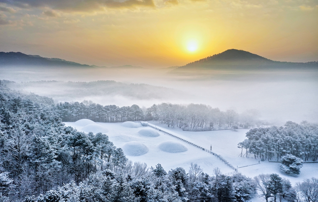 (서울=연합뉴스) 박상현 기자 = ▲ 국립부여문화재연구소는 무령왕릉 발굴 50주년을 기념해 진행한 백제 왕릉 사진 공모전 대상 수상작으로 이국한 씨가 눈 쌓인 부여 왕릉원 위로 솟은 태양을 촬영한 '일출'을 선정했다.