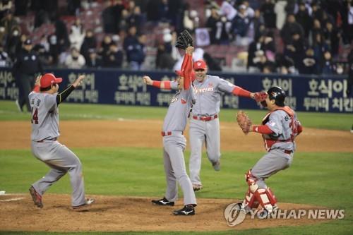 | ▲ In this file photo from Nov. 12, 2018, SK Wyverns' third baseman Choi Jeong (L) sprints toward pitcher Kim Kwang-hyun (C) after the team clinched the Korean Series title over the Doosan Bears at Jamsil Baseball Stadium in Seoul. (Yonhap) |