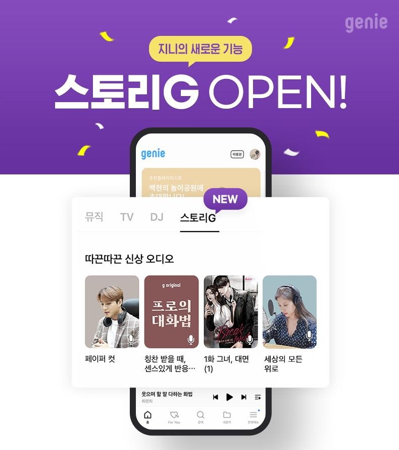 (서울=연합뉴스) 김예나 기자 = 지니뮤직은 오디오 북, 오디오 예능, 오디오 드라마 등 다양한 오디오 콘텐츠를 제공하는 전문 서비스 '스토리G'를 시작한다고 26일 밝혔다.