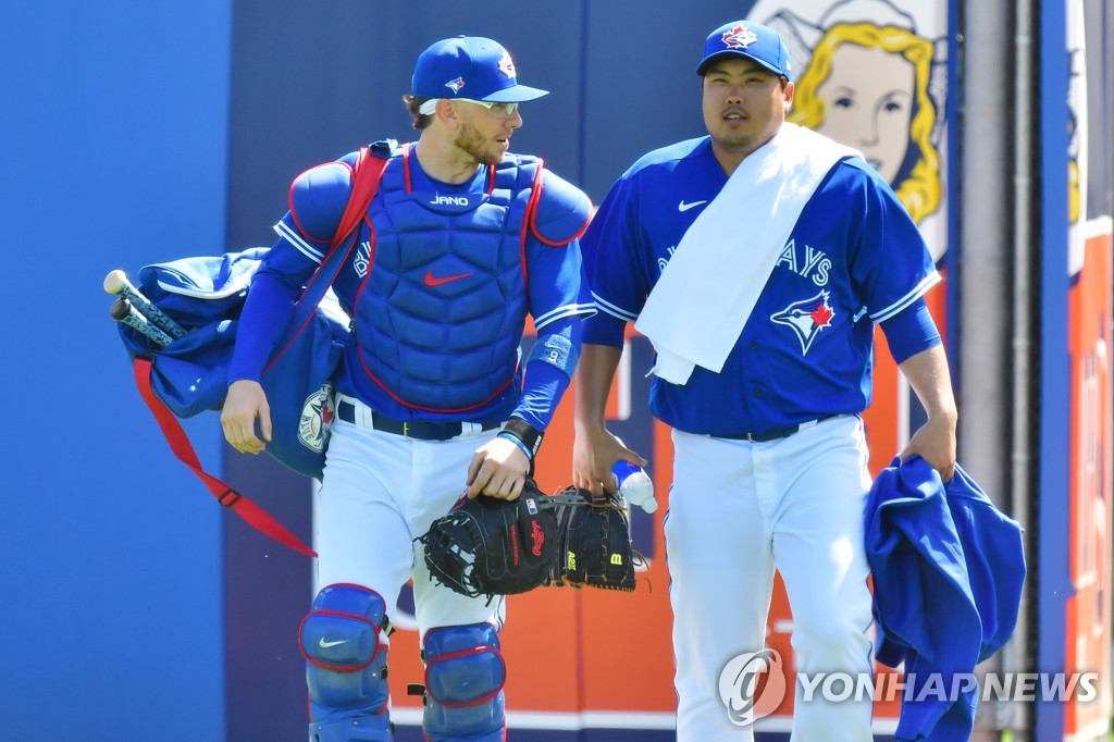 ▲ In this Getty Images photo, Ryu Hyun-jin of the Toronto Blue Jays (R) and his catcher, Danny Jansen, walk out to the field at TD Ballpark in Dunedin, Florida, before a Major League Baseball spring training game against the Baltimore Orioles on March 5, 2021. (Yonhap)