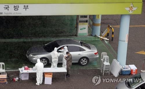 | ▲ COVID-19 tests are conducted at a drive-thru testing station at the defense ministry in Seoul on Feb. 16, 2021, as the first case among the Joint Chiefs of Staff was reported earlier in the day. (Yonhap) |