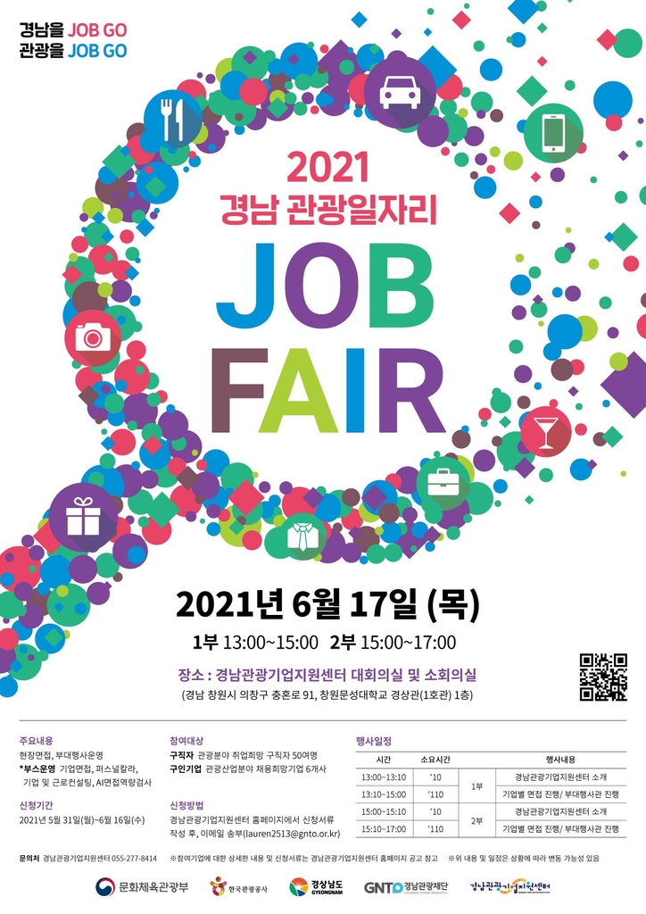 관광분야 취업을 준비하는 학생과 도민이 이번 행사에 참여하려면 오는 16일까지 경남관광기업지원센터 홈페이지(https://gyeongnam.tourbiz.or.kr/)에서 신청하면 된다.