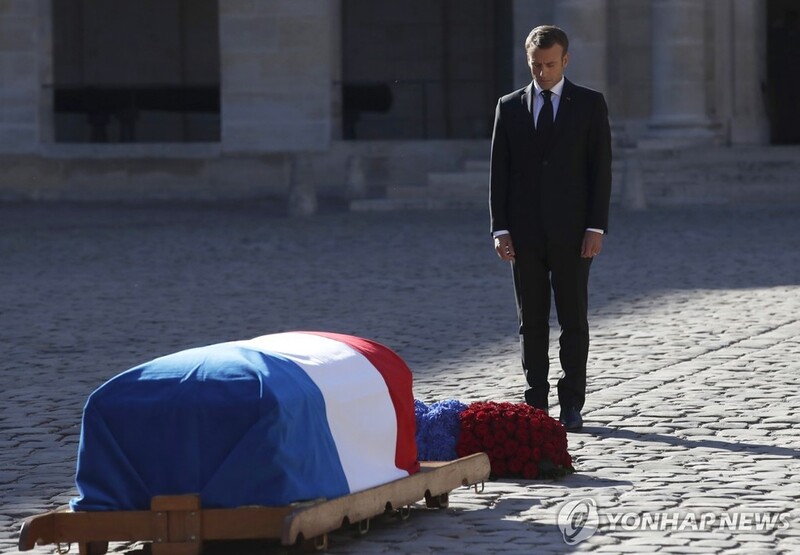 | ▲ 샹송 스타 앞 묵념하는 마크롱 대통령 (EPA 파리=연합뉴스) 2018년 10월5일 앵발리드에서 열린 샹송스타 아즈나부르 국가추도식에 참석한 마크롱 대통령이 고인의 관 앞에서 고개 숙여 묵념하고 있다. |