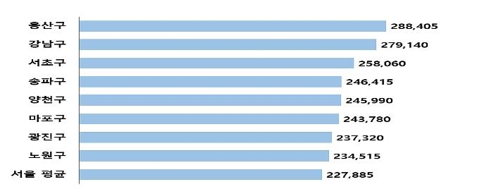 서울 내 자치구별로 살펴보면 용산구가 28만8천405원으로 가장 높았고, 동대문구가 18만8천360원으로 가장 낮았다.
