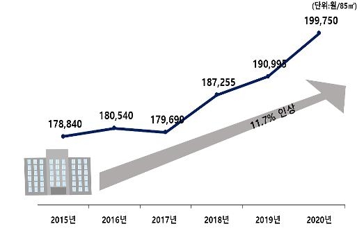 국민주택규모인 전용면적 85㎡ 기준으로 환산하면 17만8천840원에서 19만9천750원으로 11.7% 상승한 것이다. 이는 같은 기간 소비자물가 상승률(5.42%)의 2배가량 되는 수준이다.