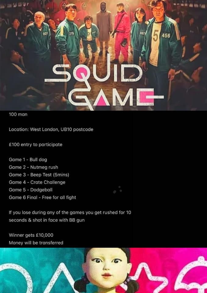 한편에선 게임에서 지면 BB탄에 맞는 '오징어 게임' 실사판 광고가 소셜 미디어에서 퍼지자 영국 경찰이 경고하고 나섰다.