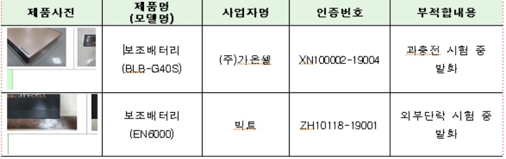 그 결과 과충전·합선 시험에서 발화하는 등 안전기준에 부적합한 2개 제품은 수거 등의 명령(리콜)을 내렸다.