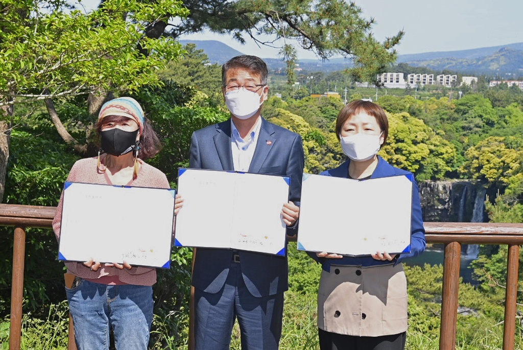 | ▲ '하영올레' 활성화 업무협약 (서귀포=연합뉴스) 김태엽 서귀포시장(가운데), 서명숙 제주올레 이사장(왼쪽), 고은숙 제주관광공사 사장이 3일 오전 제주 서귀포시 칠십리시공원에서 '하영올레' 업무협약을 체결한 뒤 기념촬영을 하고 있다. 2021.5.3 [서귀포시 제공, 재판매 및 DB 금지] |