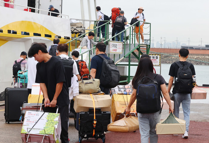Holidaymakers carrying boxes of gifts board a ferry bound for their island hometown at a passenger terminal in Incheon, some 30 kilometers west of Seoul, on Sept. 13, 2024, four days before the Chuseok holiday. (Yonhap)
