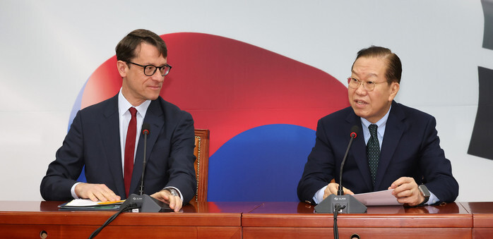 Kwon Young-se (R), chief of the ruling People Power Party's emergency leadership committee, talks with French Ambassador to South Korea Philippe Bertoux during their meeting at the National Assembly in Seoul on Feb. 24, 2025. (Yonhap)