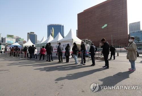 | ▲ People stand in line to take coronavirus tests at a makeshift testing site in front of Seoul Station on March 27, 2022. South Korea reported 318,130 new virus cases on the day. (Yonhap) |
