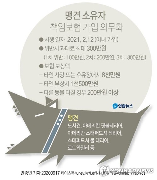 | ▲ [그래픽] 맹견 소유자 책임보험 가입 의무화 (서울=연합뉴스) 반종빈 기자 = 맹견을 기르고 있는 사람은 내년 2월 12일까지 맹견 책임보험에 가입하지 않으면 최대 300만원의 과태료가 부과된다. bjbin@yna.co.kr 트위터 @yonhap_graphics 페이스북 tuney.kr/LeYN1 |