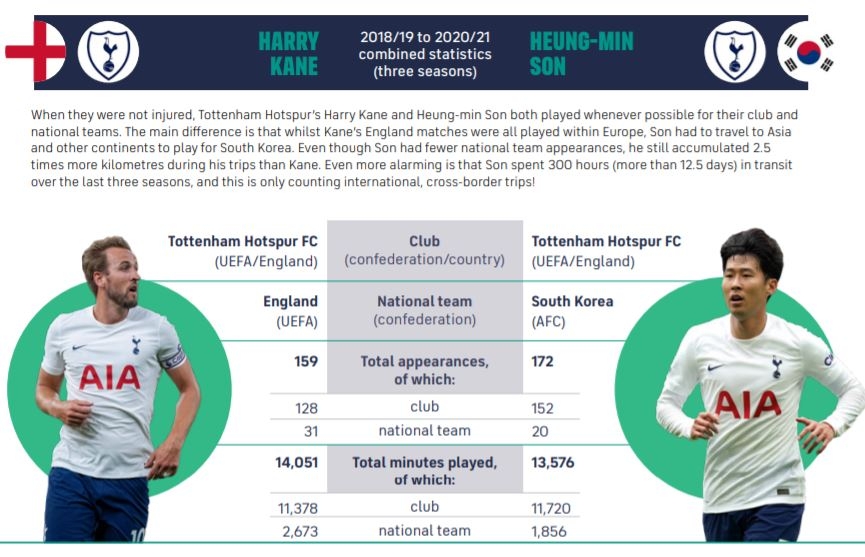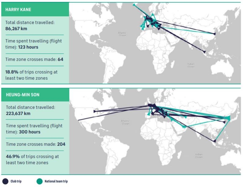 2018년 6월부터 2021년 8월까지 선수들이 소화한 4만 경기를 토대로 작성된 보고서에서 손흥민이 국가 간 이동 거리가 많은 선수의 예시로 소개됐다.