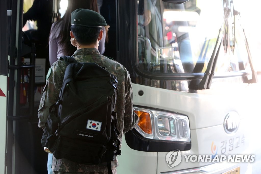 | ▲ This file photo taken May 8, 2020, shows an Army solider getting ready to board a bus at a bus station in Chuncheon, Gangwon Province. (Yonhap) |