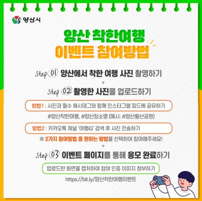 자전거·도보 여행 등 친환경 교통수단을 이용하거나, 텀블러·에코백을 사용하는 모습, 관광지에서 쓰레기를 줍거나 자기 쓰레기를 가져가고 분리 배출하는 장면을 찍어 해시태그(#양산착한여행 #양산장소명)를 달아 자신의 인스타그램에 공유하거나 카카톡 '여행iQ'에 올리면 된다.