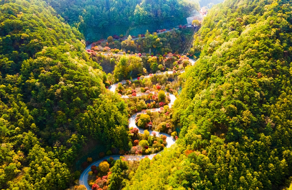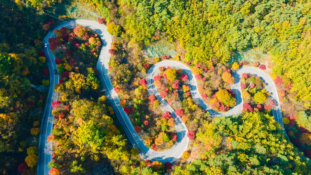 (단양=연합뉴스) 충북 단양군 가곡면 보발리와 영춘면 백자리를 잇는 고갯길 보발재에서 단풍철을 맞아 색의 향연이 펼쳐지고 있다.