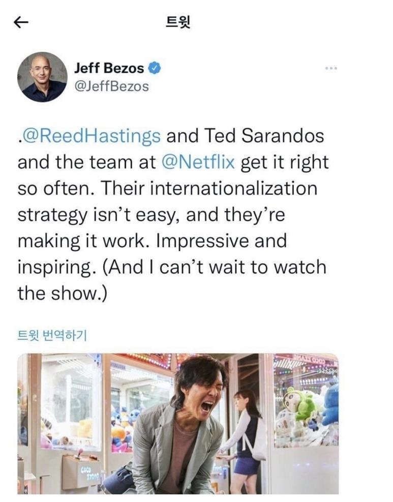 제포 베이조스는 3일 자신의 트위터에 '오징어 게임'의 스틸컷을 올리며 "넷플릭스의 국제화 전략이 쉽지 않아 보였지만 잘해나가고 있다"고 말했다.