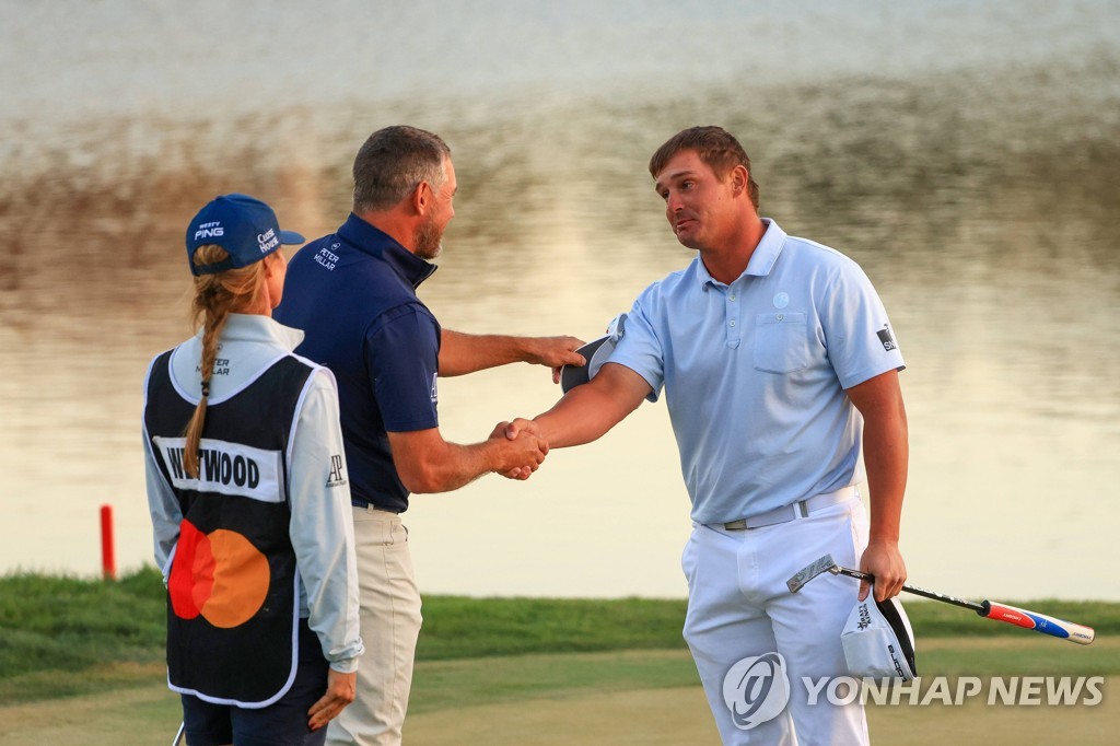 | ▲ 우승 경쟁 벌인 웨스트우드와 악수하는 디섐보 [게티이미지/AFP=연합뉴스] |