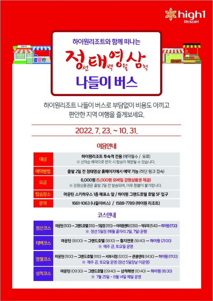 정선행은 정선오일장날(끝자리 2·7일) 오전 11시에 출발해 오일장·아리랑 센터·덕우리를 거쳐 하이원리조트로 돌아오는 코스다.