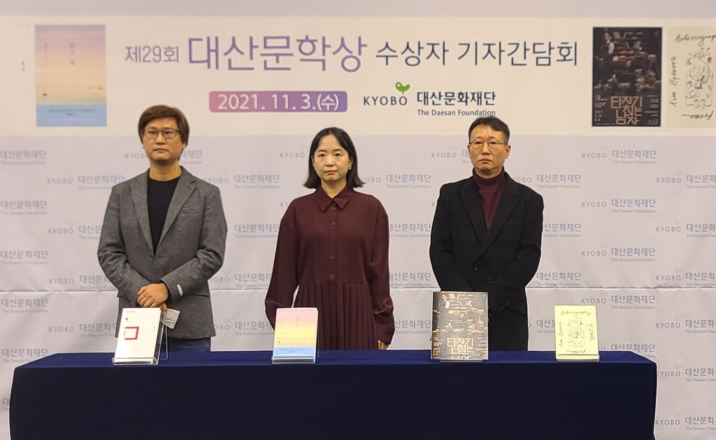 | ▲ 제29회 대산문학상 수상자 (서울=연합뉴스) 양정우 기자 = 제29회 대산문학상 수상자로 최은영(소설), 김언(시), 차근호(희곡), 최돈미(번역) 씨가 3일 각각 선정됐다. 왼쪽부터 김언, 최은영, 차근호씨. 최돈미 씨는 해외에 머무는 관계로 이날 기자간담회에 참석하지 못했다. 2021.11.3 eddie@yna.co.kr (끝) |