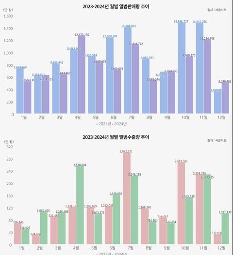 | ▲ 작년 월벌 앨범 판매량과 수출량 [써클차트 제공. 재판매 및 DB 금지] |