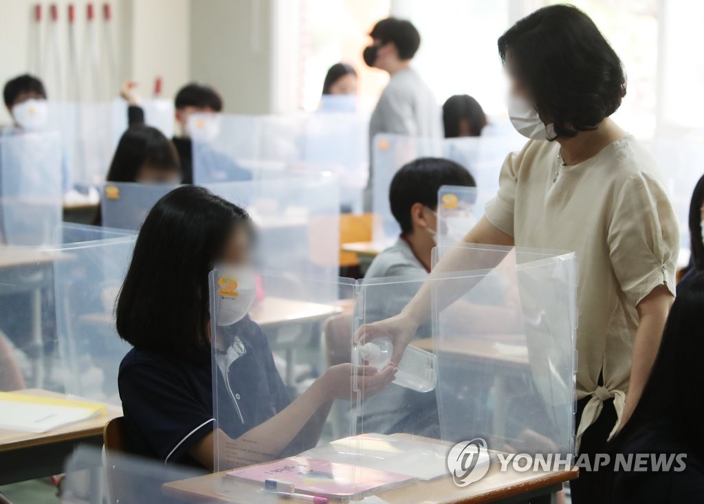 | ▲ A teacher gives hand sanitizer to a student at a middle school in Suwon, 46 km south of Seoul, on June 14, 2021. (Yonhap) |