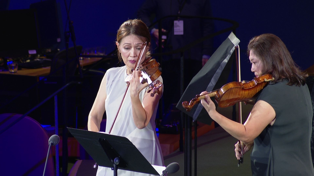 | ▲ 30년 전 연주했던 곡으로 남북한 유엔 동시 가입 30주년 축하 (뉴욕=연합뉴스) 강건택 특파원 = 21일(현지시간) 미국 뉴욕 유엔본부 총회장에서 열린 '유엔의 날 기념 문화공연'에서 재미 바이올리니스트 듀오인 안젤라 전·제니퍼 전 자매가 윤이상 작곡의 '페초 판타지오소'를 30년 만에 공연하고 있다. 2021.10.21. [KBS 제공. 재판매 및 DB 금지] firstcircle@yna.co.kr |