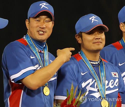 ▲ In this file photo from Nov. 19, 2010, Bong Jung-keun (L), captain of the South Korean baseball team, teases his teammate Choo Shin-soo for crying during the medal ceremony of the Guangzhou Asian Games, following South Korea's 9-3 victory over Chinese Taipei in the gold medal game at Aoti Baseball Field in Guangzhou, China. (Yonhap)
