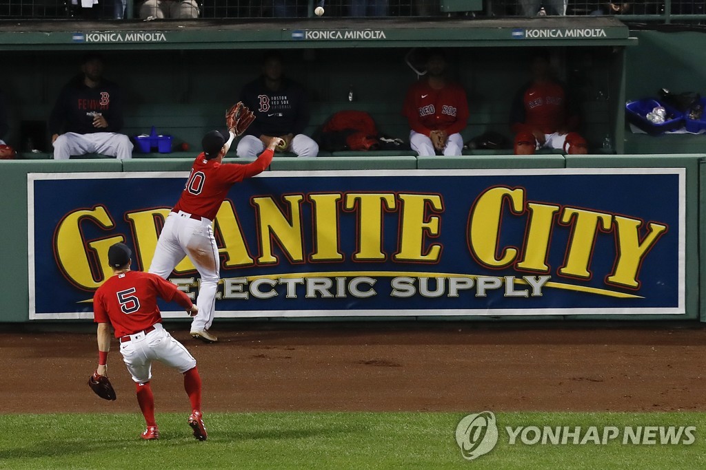 | ▲ 외야수 몸 맞고 담 밖으로 넘어가는 타구 (보스턴 AP=연합뉴스) 보스턴 레드삭스 우익수 헌터 렌프로가 11일(한국시간) 미국 매사추세츠주 보스턴의 펜웨이 파크에서 열린 탬파베이와의 아메리칸리그 디비전시리즈 3차전 연장 13회 초 자신의 몸을 맞고 담 밖으로 날아가는 공을 바라보고 있다. |