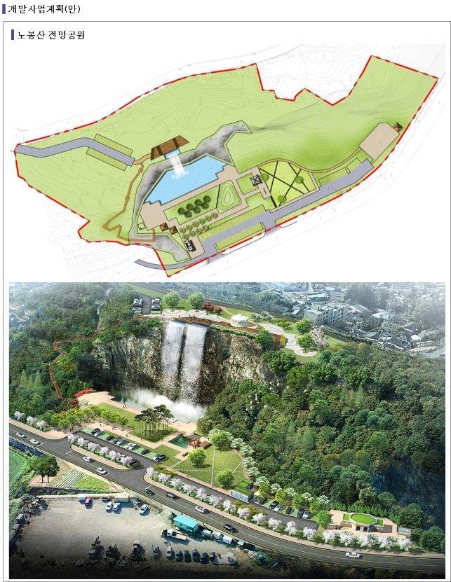 2만5천여㎡에 달하는 노봉산 관광 자원화 사업에는 석산 개발 뒤 방치된 노봉산 암벽에 설치하는 높이 50여m, 폭 40m(하부 기준)의 인공폭포가 백미다.