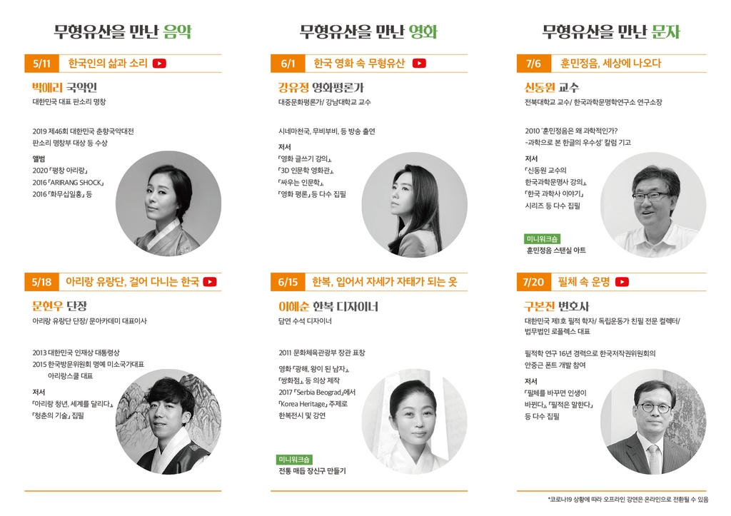 온라인 강연 강사로는 국악인 박애리 씨, 문현우 아리랑 유랑단장, 영화평론가 강유정 씨, 구본진 변호사가 나선다.